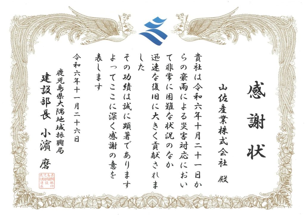山佐産業株式会社:「令和6年度災害支援協力に対する感謝状」をいただきました
