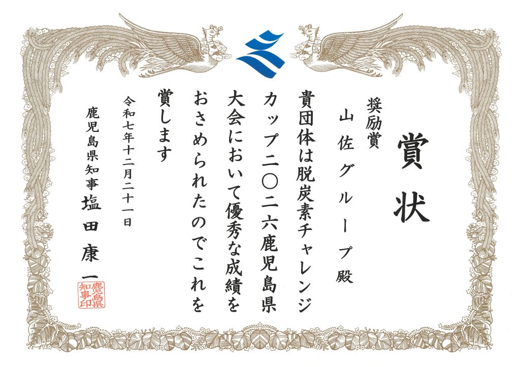 今回の鹿児島県大会では、当社を含む「山佐グループ」が奨励賞に選出され、地域の皆様と共に進めてきた脱炭素推進の取り組みが高く評価されました。